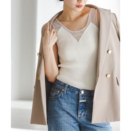 NOBLEで高い人気を誇るジャケットとの新しいスタイル提案で生まれたシアー素材とニットのコンビタンクトップ。
