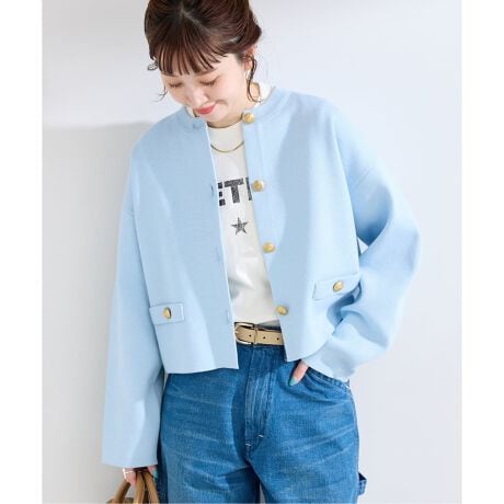 ハリ感がありつつ程よい柔らかさと肌ざわり良い素材感が特徴です。クルーネックのジャケットライクなシルエットに、存在感ある金釦がアクセントになってます。ボトムを選ばず、ニットならではの着心地の良さとラフさを楽しんで頂けます。