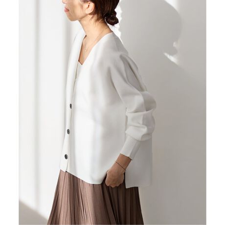 体のラインを拾いにくく、アウター感覚で着ていただけるカーディガンです。