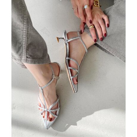 縦横にクロスするカーヴィなナローストラップが、足元をすっきり見せてくれるサンダル。
