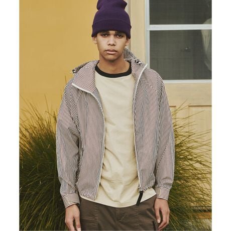 トラディショナルなチェックやストライプ柄を落とし込んだ、フード付きブルゾン。