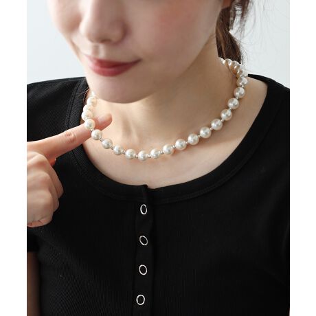 ほどよい大きさの9mmパールのネックレスはTシャツやスウェットなどと合わせると