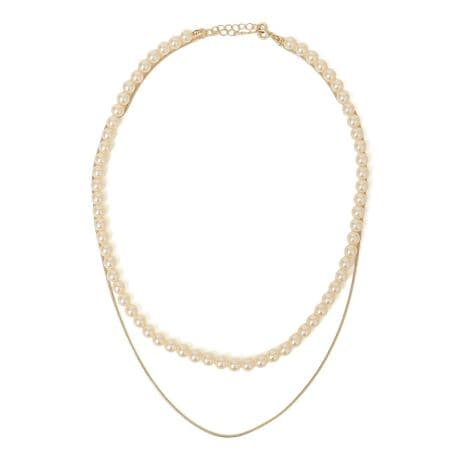 上品見えするパールモチーフと、シンプルで華奢なスネークチェーンが2連になったネックレスです。