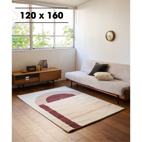 アイボリーをベースに、テラコッタとベージュカラーのタイルや円形柄モチーフを組み合わせたラグ。