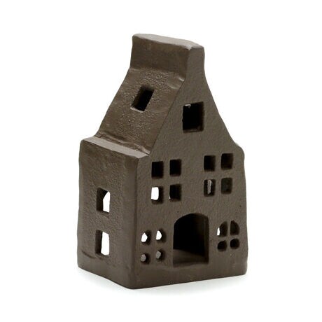 小さい家の形のオブジェです。シンプルながらも独特の風合いを持ち、窓やドアの部分がくりぬかれたデザインになっています。中にキャンドルを入れると窓やドアから柔らかい光がこぼれるキャンドルホルダーになります。
