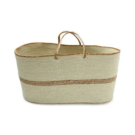 シーグラスでできたナチュラルなバスケットです。ナチュラルな色合いにラインと縁取りがアクセントになっています。横に広く大きめのデザインで通気性がいいため、ランドリーバッグやブランケットなど見せる衣服の収納にも◎。