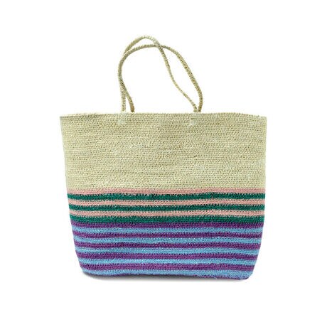 カラフルなボーダー柄が特徴的なトート型のバスケットです。ボーダーの色の組み合わせによって印象が少しずつ変わるデザインで、A4サイズ程度の日用品や書類を収納するのに適したサイズです。