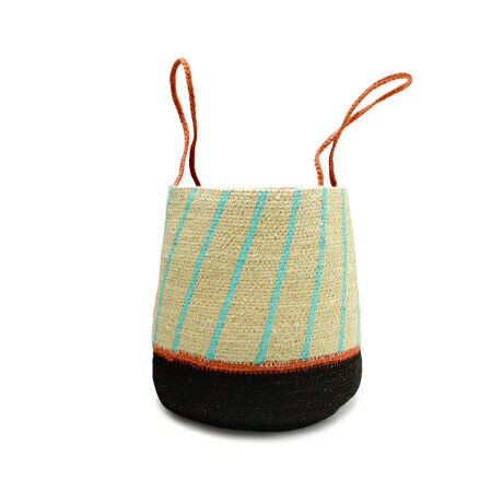 カラフルな持ち手とストライプが特徴的なバスケットです。小さめの観葉植物の鉢カバーや、リモコンなどを収納する小物入れにも最適です。
