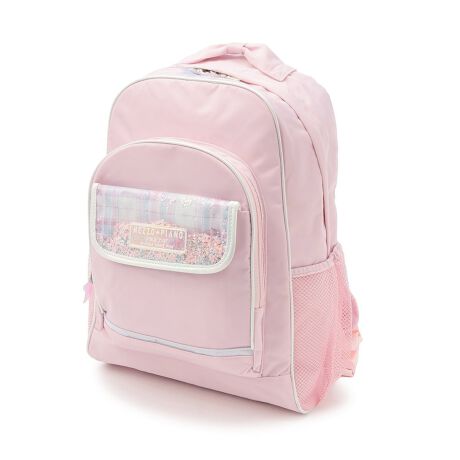 学校行事、お出かけ、旅行など、さまざまなシーンで活躍するサイズ感のリュックです。フロントポケットはメゾピアノオリジナルチェック柄にキラキラとしたラメやスパンコールを閉じ込めました。オーロラなツヤのロゴパッチもポイント。ショルダーの胸部分にベルトがついているので肩からずり落ちにくく、お子さまが疲れにくい仕様となっています。その他にもDカンや反射シート、長さを調節できるテープをプラス。ペットボトルや水筒を入れるのにぴったりなメッシュ素材のサイドポケットつきです。内側にはお名前シートつき。≪重さ≫F/約460g