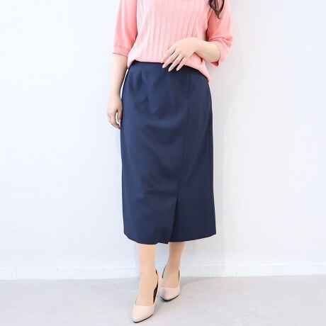 薄手のニットや、シンプルなブラウスをインして着用いただくと、ミモレ丈とフロントベンツが、品格のある大人っぽいシルエットを演出し、きちんと感のあるオフィススタイルが完成します。