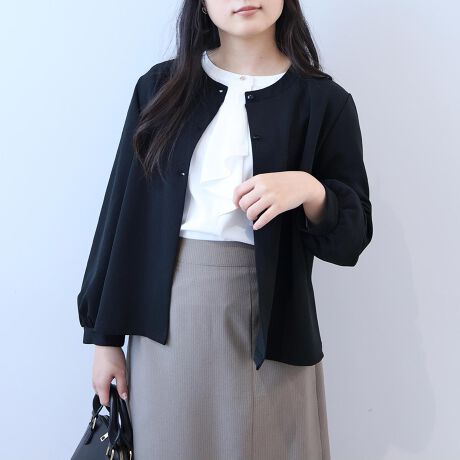 ワンピースやフレアスカートの上から軽く羽織って頂くと、ポワン袖と9分袖丈が女性らしいムードを高め、大人シンプルなフェミニンスタイルに格上げする1枚です。