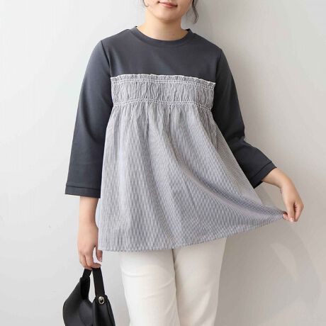 カットソーの楽な着心地と、ブラウスの華やかさを一枚で楽しめる、いいとこ取りのドッキングチュニック。