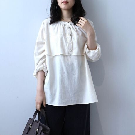 ボリュームのあるプリーツスカートや落ち感のあるガウチョパンツと合わせ、ブラウスのポコポコした素材感を活かすことでリラックス感がありながらも洗練されたカジュアルスタイルに仕上がります。