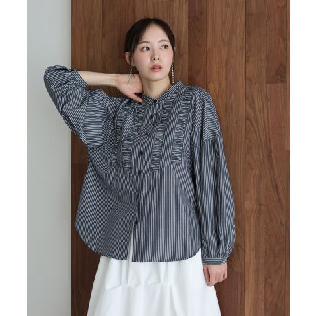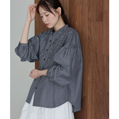 フロントのシャーリングが胸元に立体感を生み出し、シンプルなシャツスタイルにモードなニュアンスをプラスします。