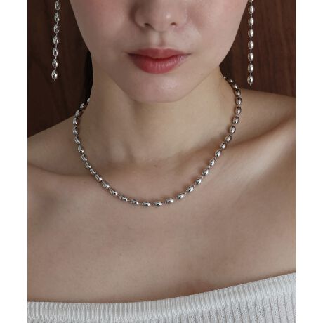 絶妙なフォルムのオーバル型パーツを連ねた、都会的なルックスのボールチェーンネックレス。