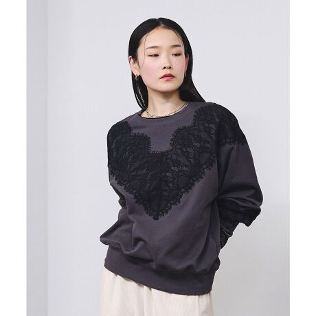 ・胸元と袖口に大胆なレースをあしらった、女性らしさ漂うスウェットデザイン