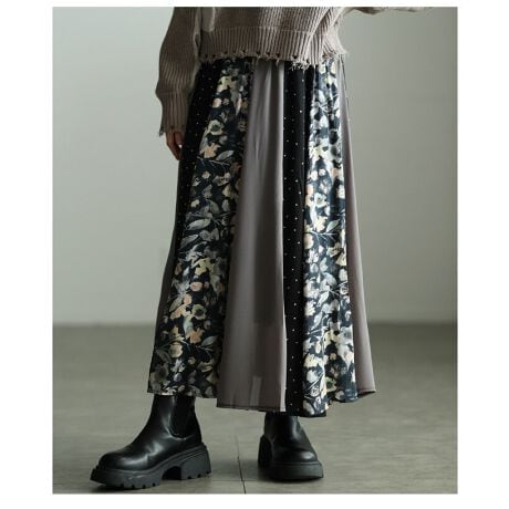 花柄や水玉、無地を組み合わせたパッチワーク風デザインが楽しいフレアスカート。動くたびに表情が変わり、穿くだけでコーデが華やぎます。甘さ控えめで大人にも取り入れやすい一枚です♪