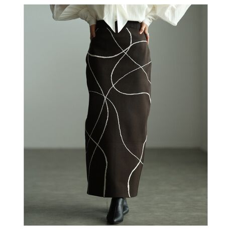 【スカート】 ニット ライン ナロー ロング スリット ウエストゴム 幾何学 ブラック ブラウン