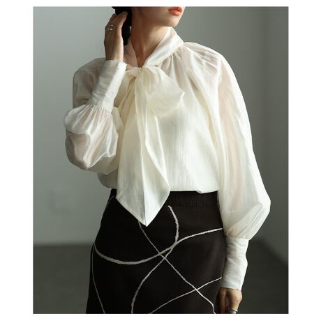 大ぶりなリボンタイが印象的なブラウス。顔まわりに華やかさを添え、シンプルなコーデも一気に主役級に仕上げてくれます。甘さがありつつも大人っぽくまとまる、頼れる一枚です♪