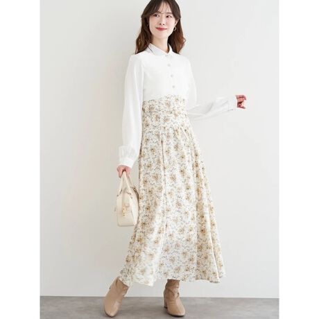 [型番:25550726086]花柄の切り替えデザインがシーズンムードを高めるワンピース。ウエストにはベルトを施しており、お好みのサイズで着用することができます。ふんわりと広がるフレアシルエットが魅力的。休日のお出かけシーンに大活躍してくれるアイテムです。モデル(アイボリー着用)身長:160cmMサイズ着用