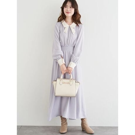 [型番:25550726127]襟や袖口のレース使いが上品なアクセントになるワンピース。ウエストはシャーリング切り替えを施しているので、フィット感のある着心地を実現します。首元のタイにあしらわれたメタルパーツがアクセントに。1枚で着用したりカーディガンと合わせたコーディネートもおすすめです。モデル(淡グレー着用)身長:160cmMサイズ着用