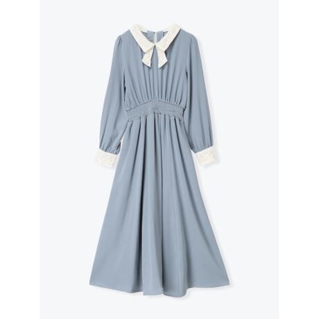 [型番:25550726127]襟や袖口のレース使いが上品なアクセントになるワンピース。ウエストはシャーリング切り替えを施しているので、フィット感のある着心地を実現します。首元のタイにあしらわれたメタルパーツがアクセントに。1枚で着用したりカーディガンと合わせたコーディネートもおすすめです。モデル(淡グレー着用)身長:160cmMサイズ着用