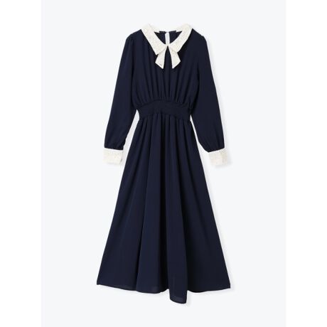 [型番:25550726127]襟や袖口のレース使いが上品なアクセントになるワンピース。ウエストはシャーリング切り替えを施しているので、フィット感のある着心地を実現します。首元のタイにあしらわれたメタルパーツがアクセントに。1枚で着用したりカーディガンと合わせたコーディネートもおすすめです。モデル(淡グレー着用)身長:160cmMサイズ着用