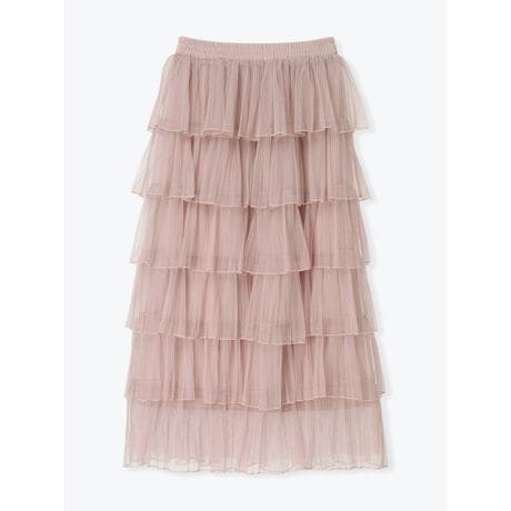 [型番:25550724923]段々に切り替えられたチュール素材がボリューム感を演出するスカート。ウエストはゴム仕様になっているので、締め付け感が少なく快適な着心地を実現します。透け感のあるチュール素材がやわらかな風合いをプラス。ブラウスやカットソーなど、様々なトップスと相性の良いアイテムです。
