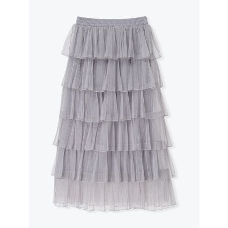 [型番:25550724923]段々に切り替えられたチュール素材がボリューム感を演出するスカート。ウエストはゴム仕様になっているので、締め付け感が少なく快適な着心地を実現します。透け感のあるチュール素材がやわらかな風合いをプラス。ブラウスやカットソーなど、様々なトップスと相性の良いアイテムです。