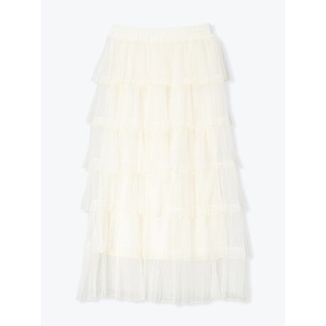 [型番:25550724923]段々に切り替えられたチュール素材がボリューム感を演出するスカート。ウエストはゴム仕様になっているので、締め付け感が少なく快適な着心地を実現します。透け感のあるチュール素材がやわらかな風合いをプラス。ブラウスやカットソーなど、様々なトップスと相性の良いアイテムです。
