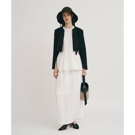トップスはウエストを程よく絞ったペプラムシルエット。たっぷりと入ったフレアが華やかさを漂わせています。