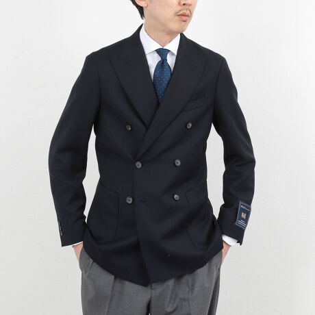 肩まわりに毛芯を入れ、接着芯仕立てでは生まれない立体的な美しいシルエットを実現したダブルジャケット。