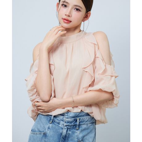 オープンショルダーフリルシフォンブラウス