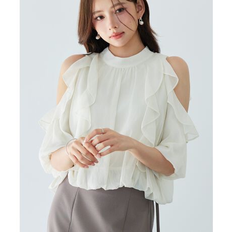 SDP0354"華やかな縦フリルとオープンショルダーのシフォンブラウス。