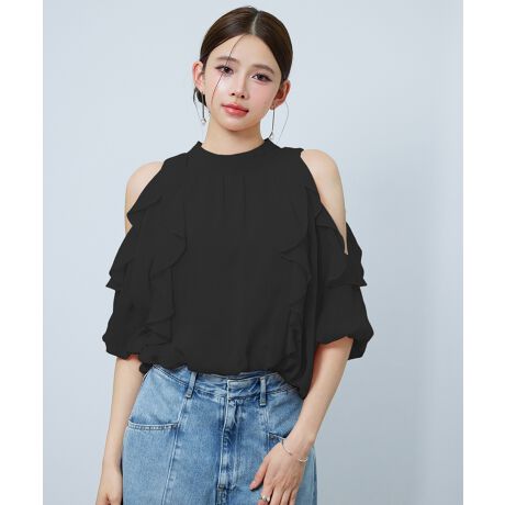 オープンショルダーフリルシフォンブラウス