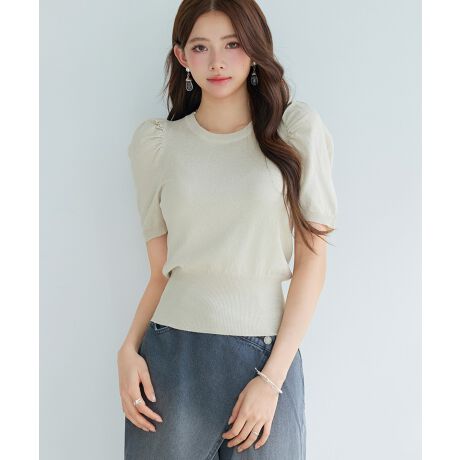 夏に着回せるクルーネックの半袖ギャザースリーブニットプルオーバー。