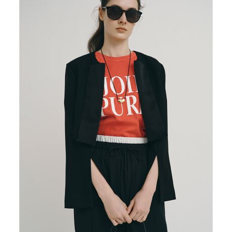 マスキュリンな雰囲気を感じるデザインですが、袖口の深いスリットや、クロップド丈のボレロに落とし込む事でどこかフェミニンな雰囲気を感じれます。太いラペルはサテンの異素材使いで華やかさを出しています。