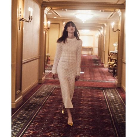 コットン、ペーパー、レーヨンの3つの素材を撚糸した表情のある糸を使用したレース編みのプルオーバーニットとワンピース。ハリのある糸を採用しているため、レース柄もスッキリシャープに仕上がっています。また、ペーパー素材は近年注目されているトレンド素材でもあり、速乾性や軽さがあり、夏のニット素材としてもおすすめです。ジャケットを合わせて袖口のリブを袖口から覗かせて重ね着のアクセントにしていただきたい。ワンピースは透けているので、デニムなどのパンツの上から重ねてきていただきたいアイテム。
