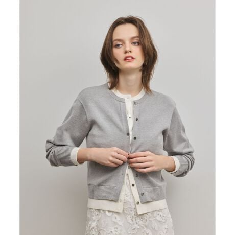 [型番:0326153319]レイヤードディテールのニットカーディガン。ハリ感を持たせた天竺編み。※こちらのモデル着用画像はサンプル品を撮影しております。実際の商品と仕様、加工、サイズが若干異なる場合がございます。予めご了承くださいませ。