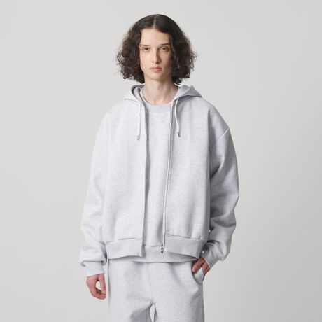 表面に裏毛、裏面天竺のボンディング素材を使用したジップアップフーディー。