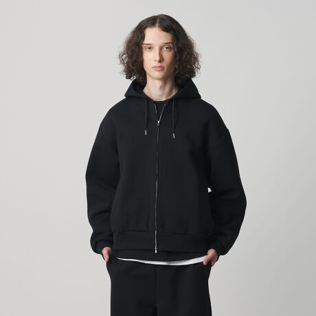 表面に裏毛、裏面天竺のボンディング素材を使用したジップアップフーディー。