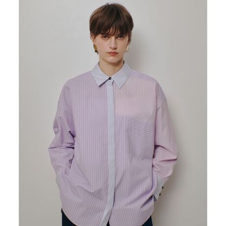 コットンのシャツ地を3タイプ組み合わせたシャツになります。オーバーサイズのドロップショルダーになり、ドルマンスリーブ要素のパターンにしているのでマニッシュな雰囲気の中に女性らしさのある雰囲気に仕上げています。胸のパッチポケットがアクセントになっています。こちらのシャツはデニムやチノ素材のボトムに合わせて着ていただくのがおすすめです