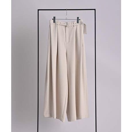 ほどよいハリ感と落ち感を兼ね備えたダブルクロスを使用した、共布くるみバックルのベルト付きワイドパンツ。