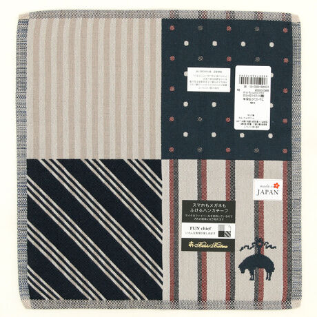 裏面にマイクロファイバー糸を使った先染ハンカチ。スマホやメガネなどの汚れが簡単に拭き取れます。
