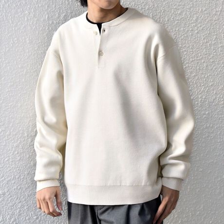 シンプルながら、首元にアクセントを加えるヘンリーネック仕様がさりげないポイントのニット。