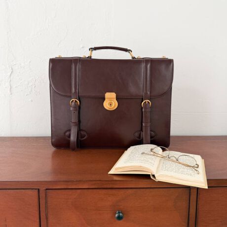 フロントのキーホールとダブルベルトのデザインがトランクのような雰囲気でレトロなサッチェルバッグ
