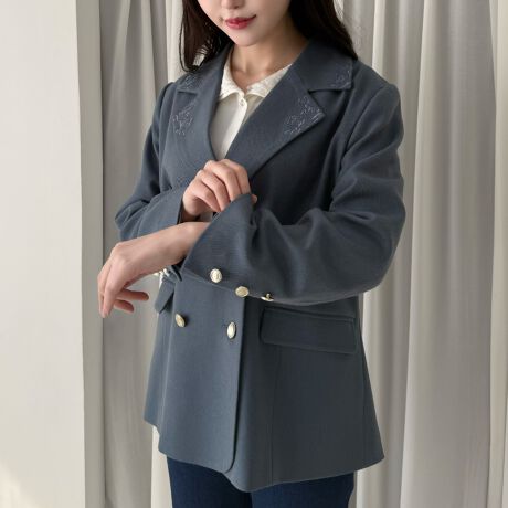 衿の繊細なローズ刺繍が目を惹くジャケット。