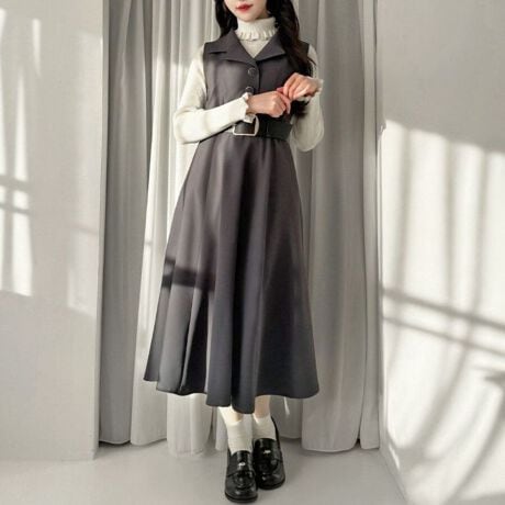 クラシカルな開衿デザインに、ゴールドバックルが効いた太めの合皮ベルトが品の良い印象に◎