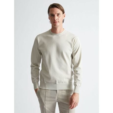 クルーネックは、ネックラインのリブ幅やテンションを繊細に調整し、詰まりすぎず開きすぎないバランスに。
