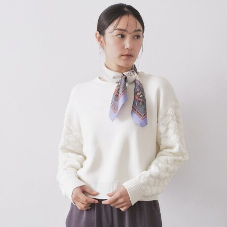 ・ボディはフラットな編地、袖はループヤーンをミックスさせたポコポコ編地。